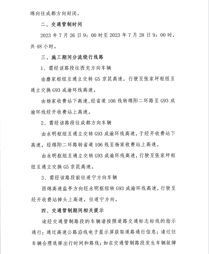 關(guān)于S1成萬(wàn)高速公路楊家至永明段實(shí)行交通管制的通告